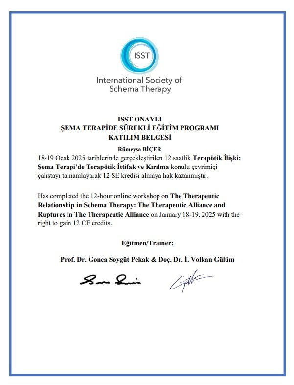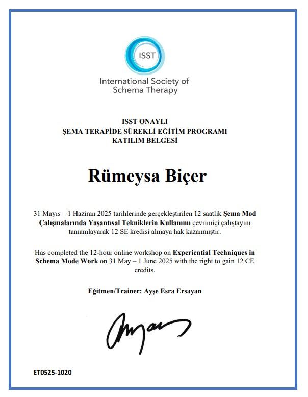 Rümeysa Biçer, meslek yaşamı boyunca aşağıda belirtilen teorik ve süpervizyon eğitimlerini tamamlamıştır.